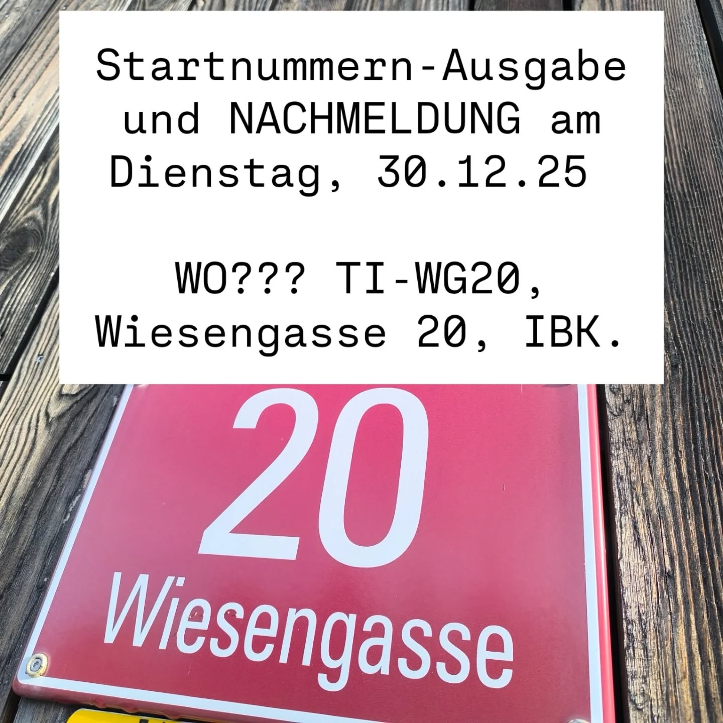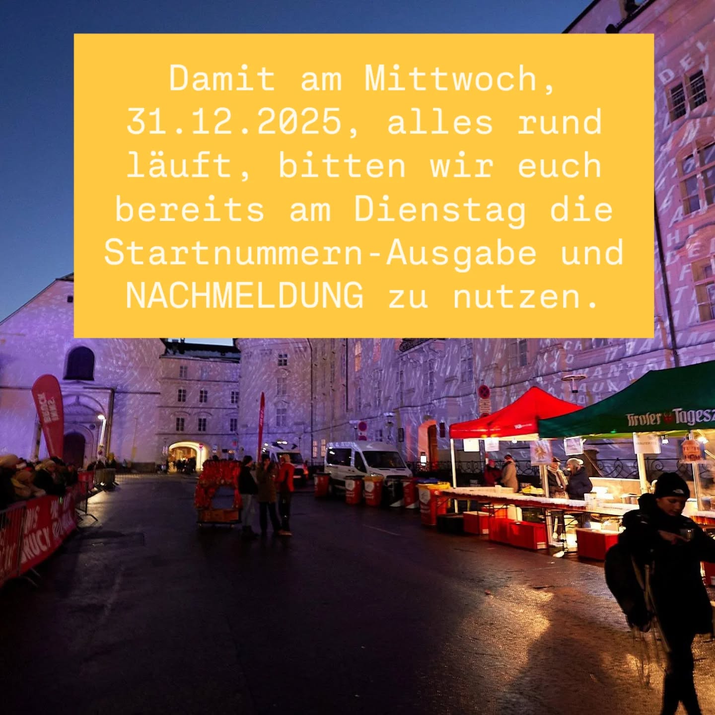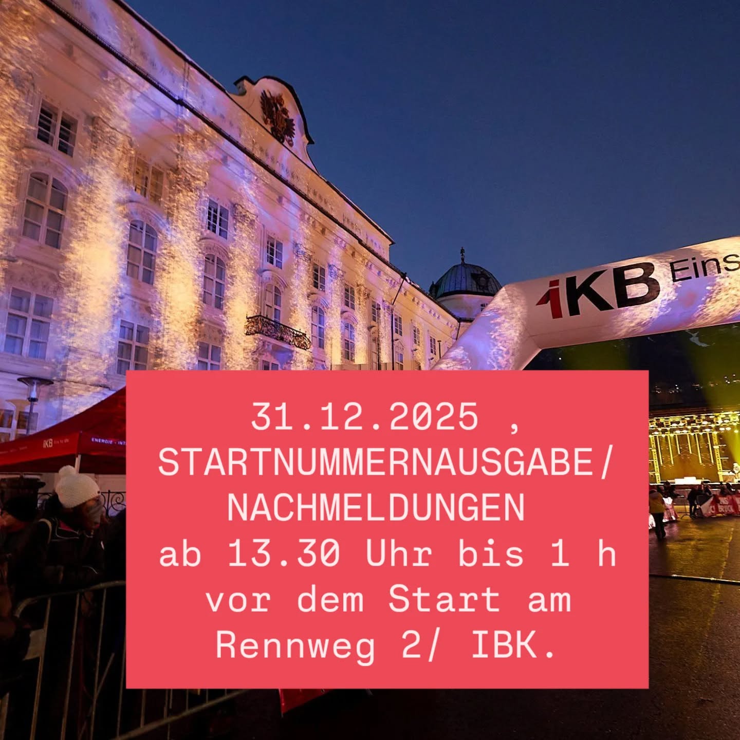 Am 31.12.25 öffnen wir die Startnummern-Ausgabe/Nachmeldung bereits um 13.30 im Start-Ziel Bereich am Rennweg 2, Innsbruck.